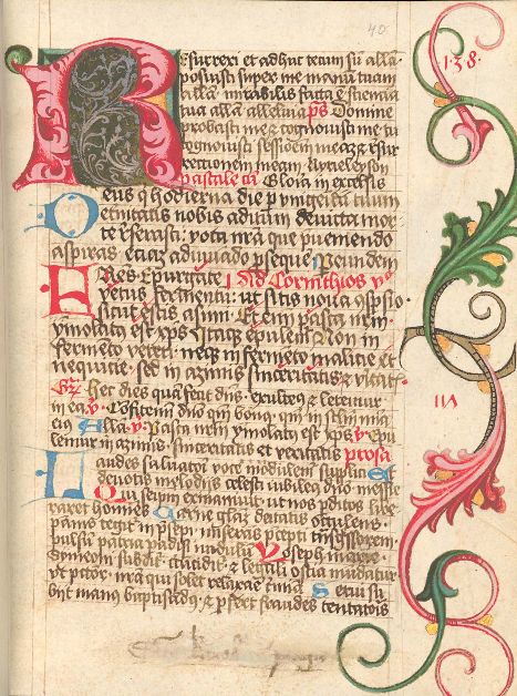 This manuscript was part of the library of the order of Regular Canons of St. Augustine at Karlov in Prague. It is assumed to have been created specifically for the Karlov Canonry, as it includes the feast day of Charlemagne and also the office for the transfer of his relics. Its presence in the Karlov Canonry’s possession in the 16th century is confirmed by to two ownership inscriptions from that period. One of the inscriptions appears on the bottom margin of folio 40r, exhibited here. The text is partially scratched out, but it likely read Sancti Karoli in Praga.