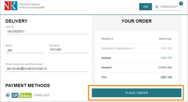 When you click on the online payment link in your reader´s account, you will be redirected to https://platby.nkp.cz. If you wish to pay the fee for renewing the NL registration this way, click on the button Complete the order.